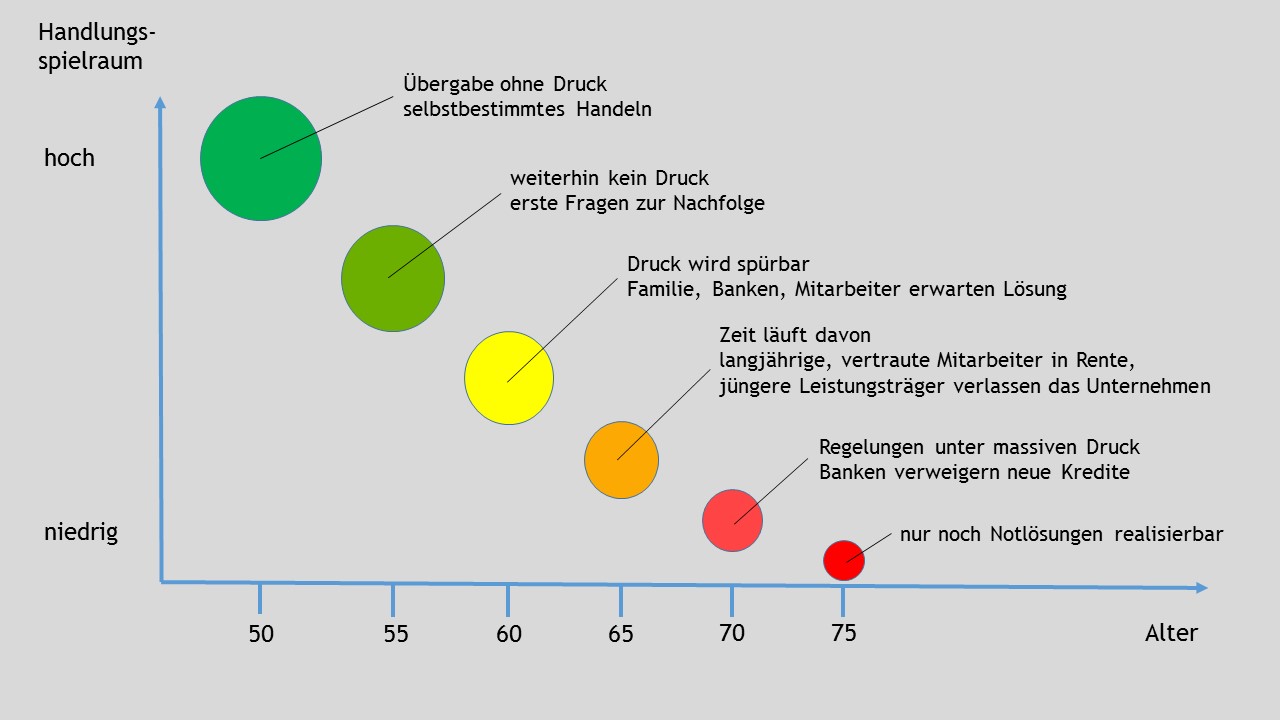 Beginnen Sie rechtzeitig mit der Nachfolgeplanung. Mit zunehmenden Alter verringern sich Ihre Handlungsoptionen. Dies hat signifikante Auswirkungen auf den Verkaufspreis.