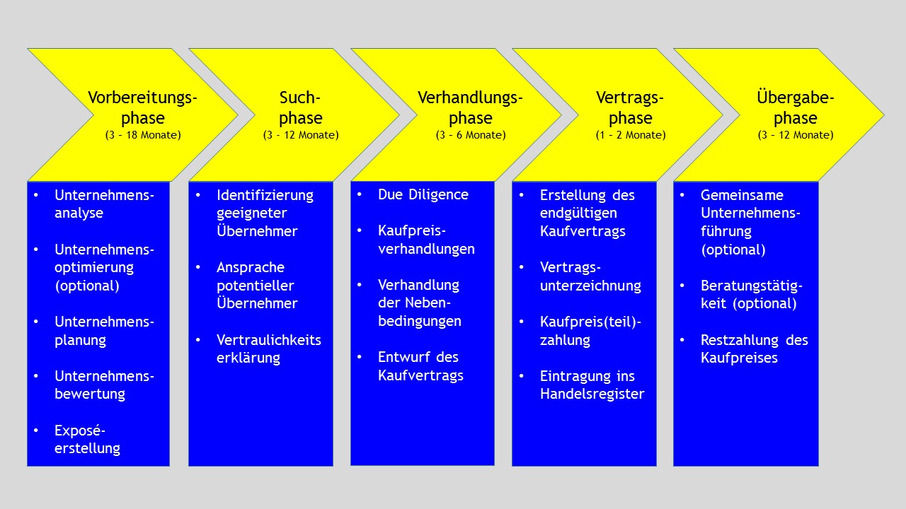 Wenn eine familieninterne Lösung nicht infrage kommt, sollten Sie für die Vorbereitung, die Suche, die Verhandlungen, den Unternehmensverkauf und die Unternehmensübergabe einen Zeitraum von 2 - 3 Jahren einplanen.